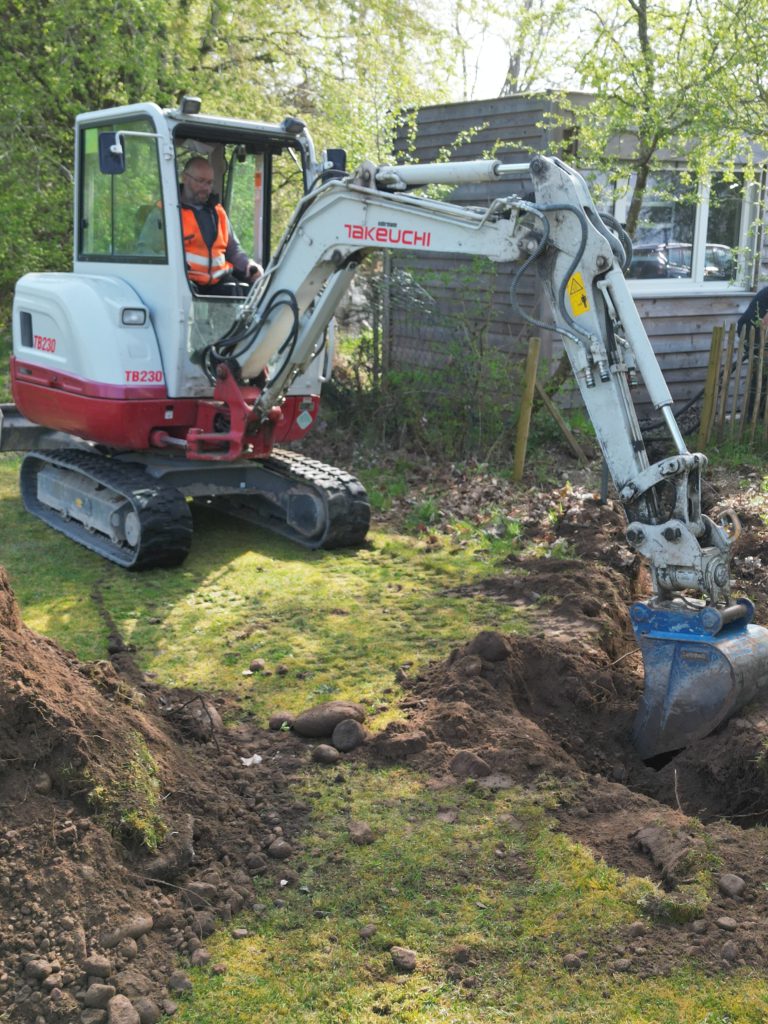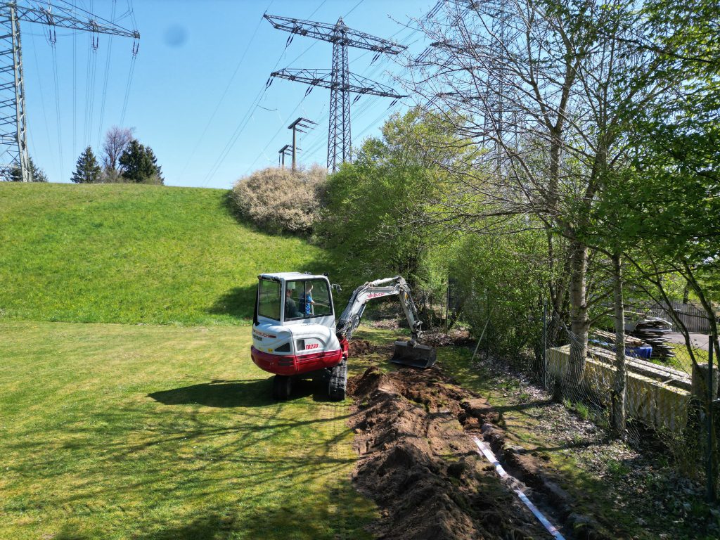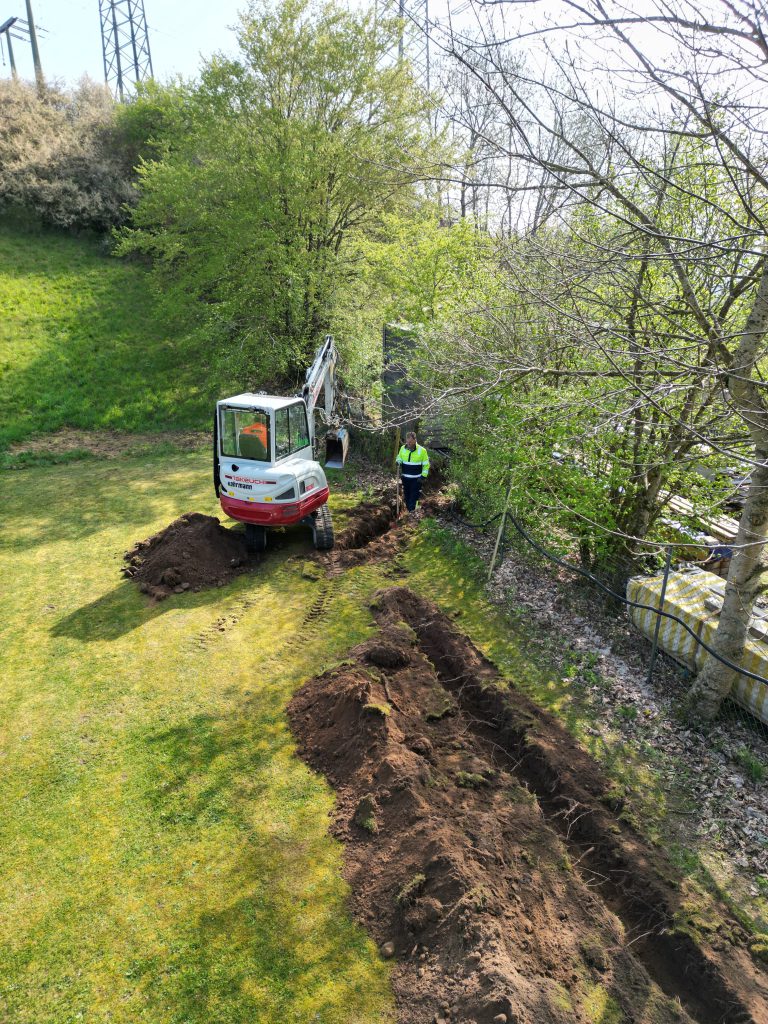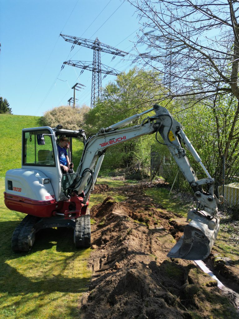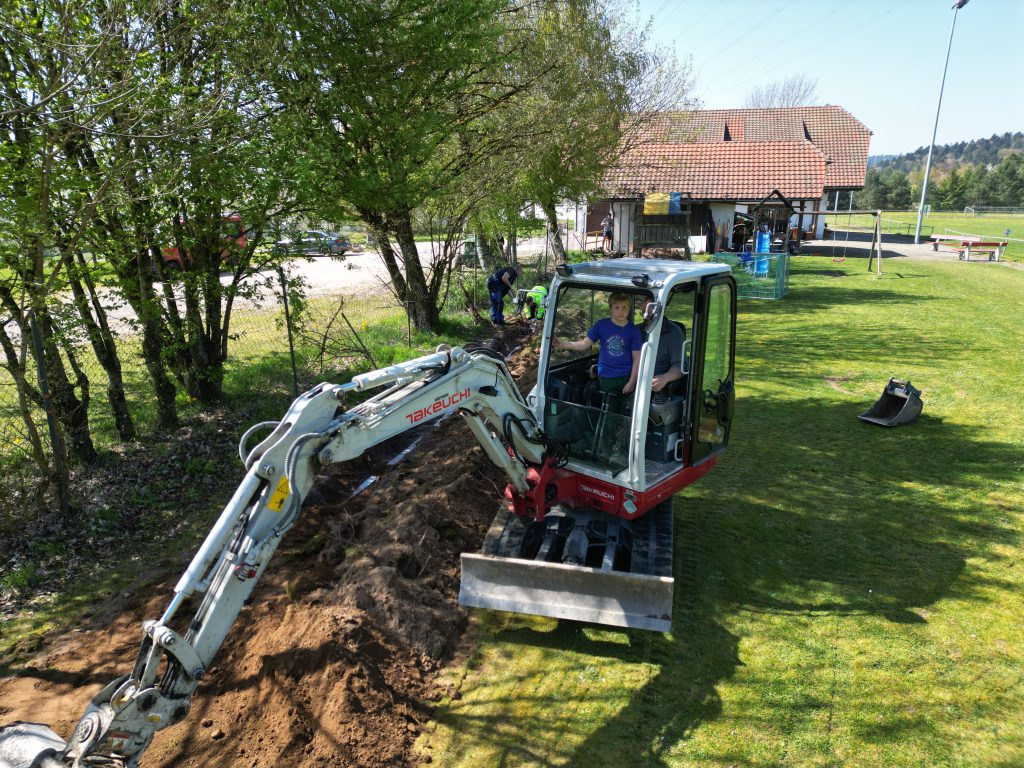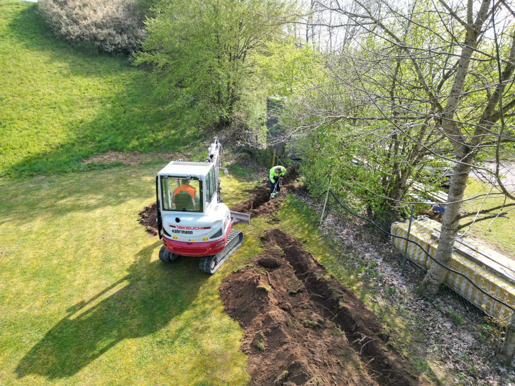 Mittlerweile hat sich ein tonnenschwerer Maulwurf an die Arbeit gemacht und wühlt sich in einer schnurgeraden Linie vom Vereinsheim aus in Richtung Schwarzwaldhaus auf dem Bienenstand.