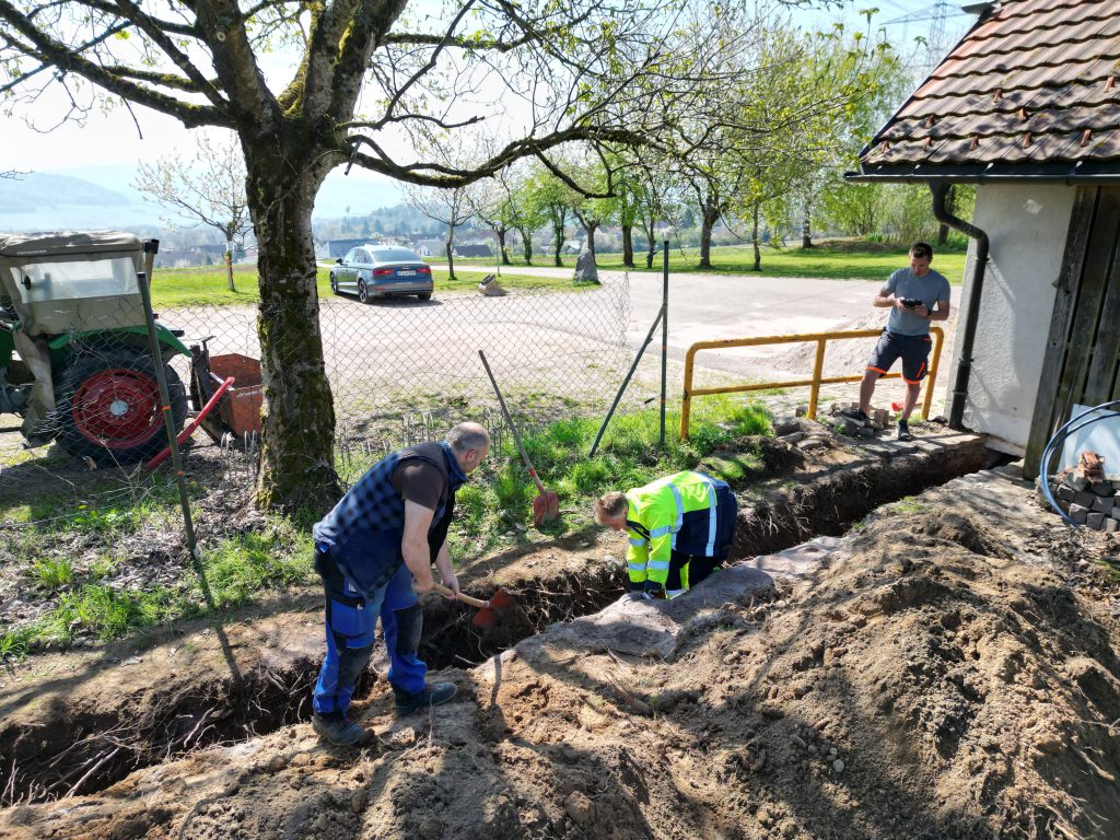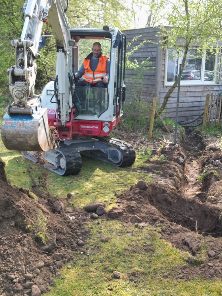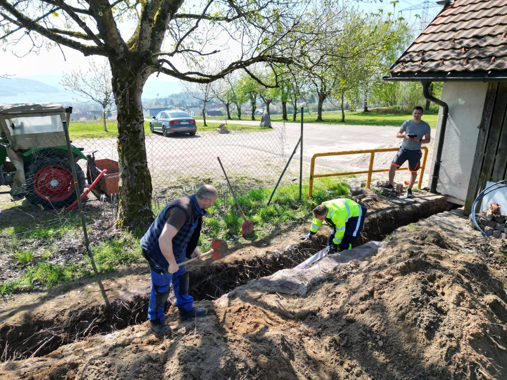 Nun ist auch die Leitung gelegt, eingesandet und das Abdeckband eingebracht. Nun wird noch der Graben wieder zugeschüttet, wobei auch der Nachwuchs tüchtig mithilft.